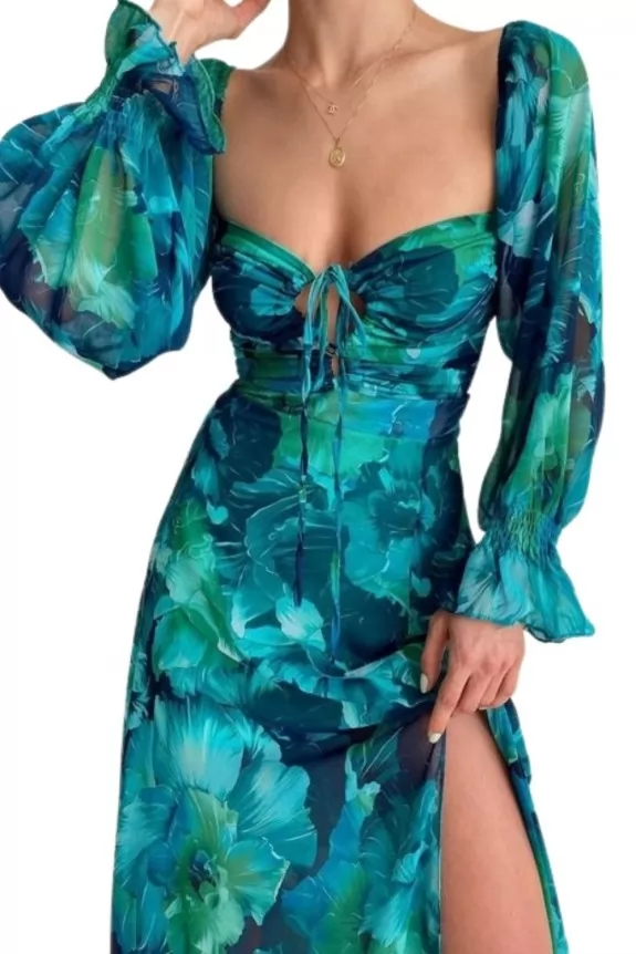 Floral Print Bishop Sleeves Side Slit Dress quantity